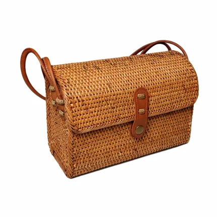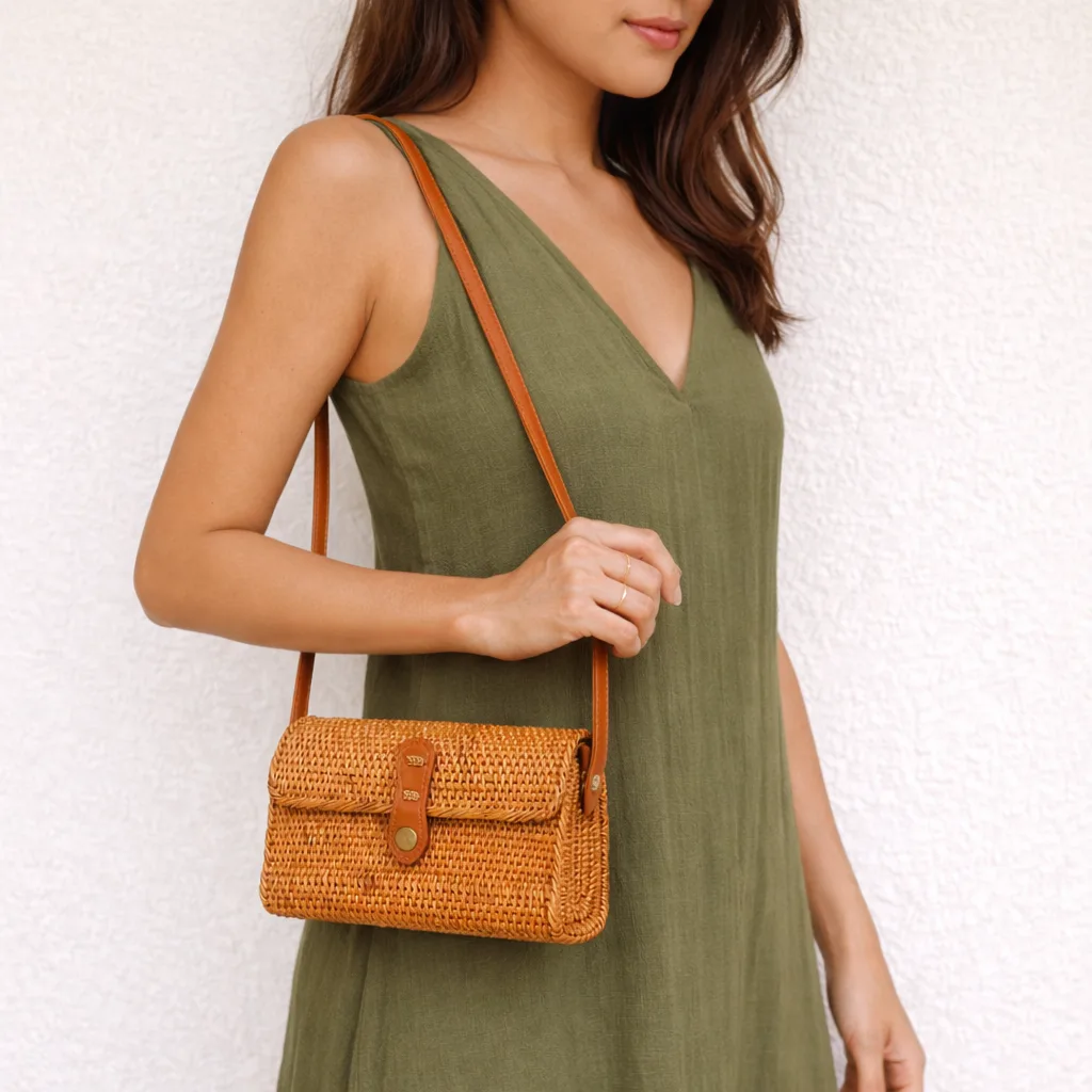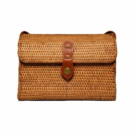 Bolsa de ratán natural tejida 100 % a mano por artesanos locales. El ratán es una fibra vegetal sostenible conocida por su resistencia, ligereza y elegancia natural. Su tejido trenzado refleja la tradición ancestral de Bali, fusionando diseño bohemio y estilo tropical.