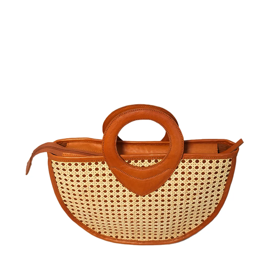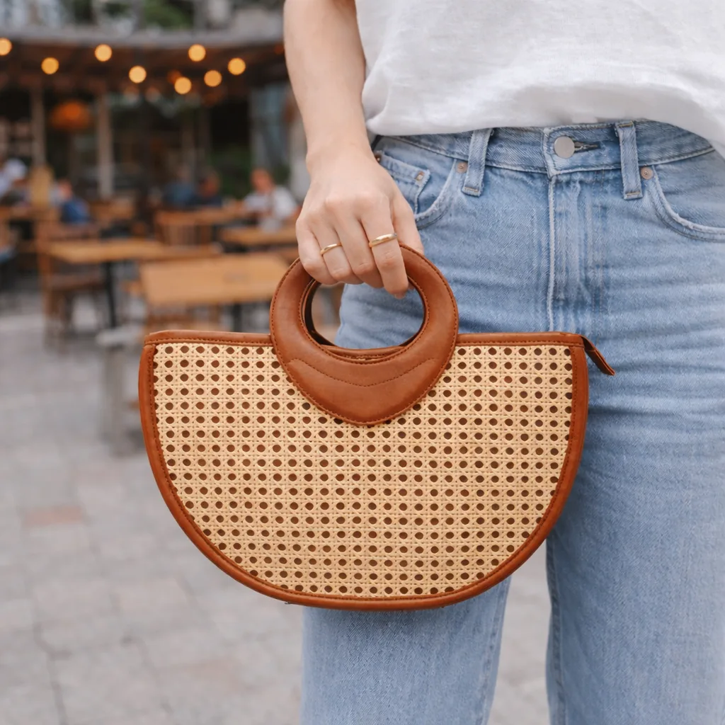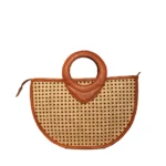 Lleva un estilo natural y elegante con esta hermosa bolsa de mano, hecha de ratán complementada con asas de cuero sintético que aportan un acabado sofisticado y moderno. Elaborada a mano por artesanos de Bali, esta pieza fusiona tradición, moda y calidad en un accesorio único.