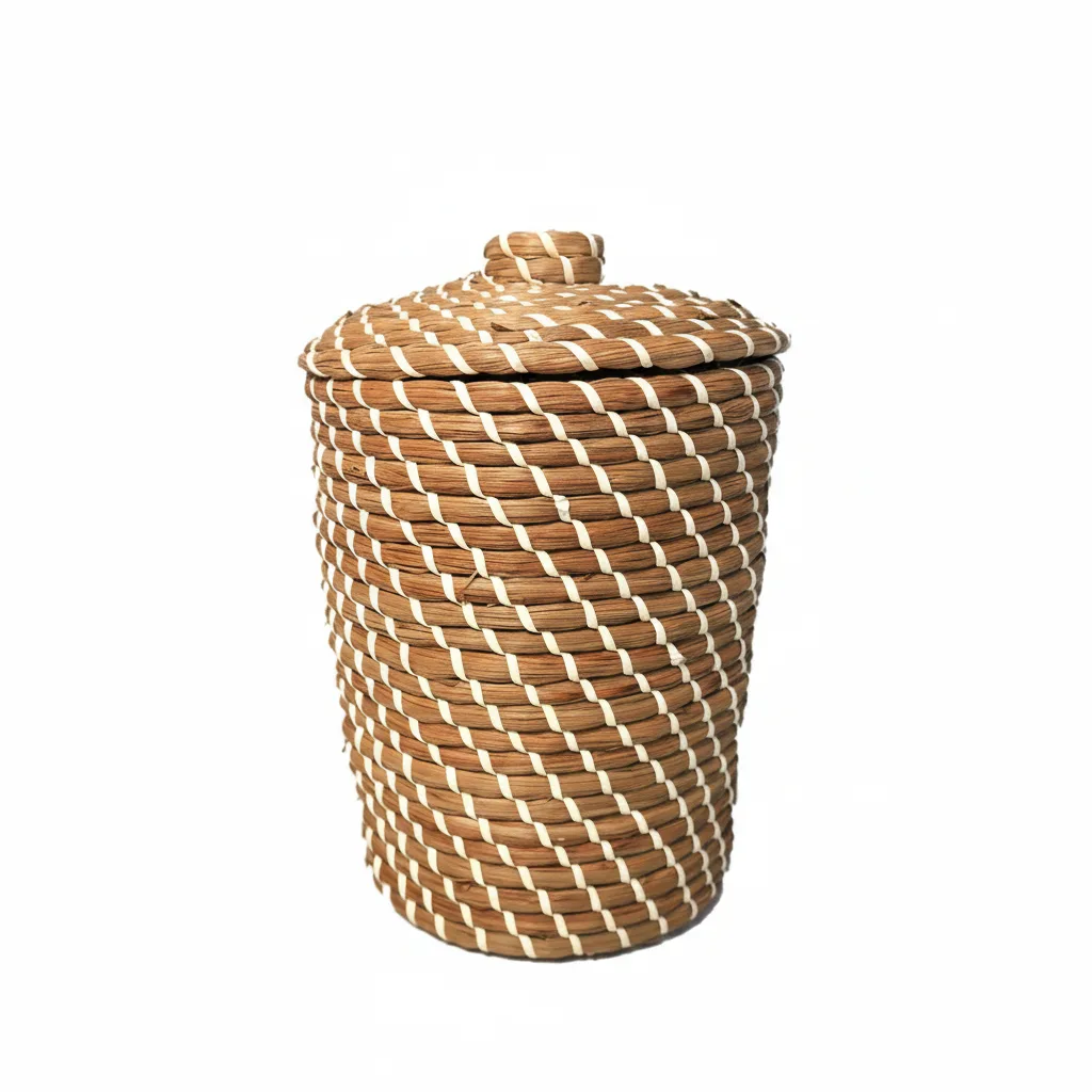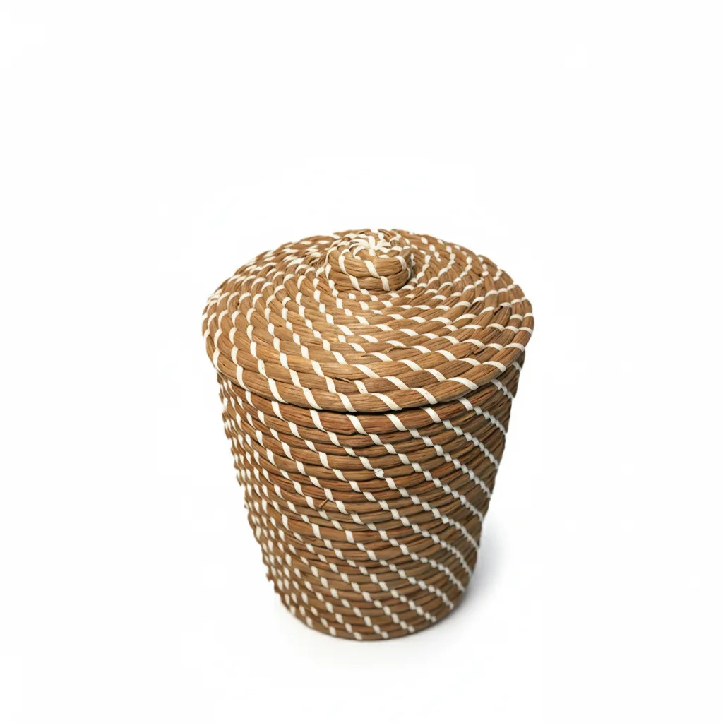 Dale un toque natural, moderno y artesanal a tu hogar con este hermoso cesto de ratán, elaborado a mano por artesanos de Bali. Su diseño entrelazado en espiral combina fibras de ratán natural con acentos blancos que crean un contraste elegante y contemporáneo, haciendo de esta pieza un accesorio decorativo único.