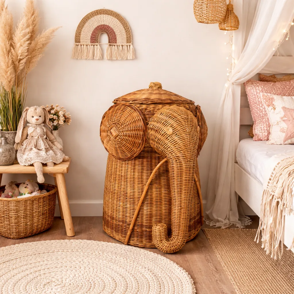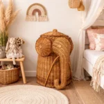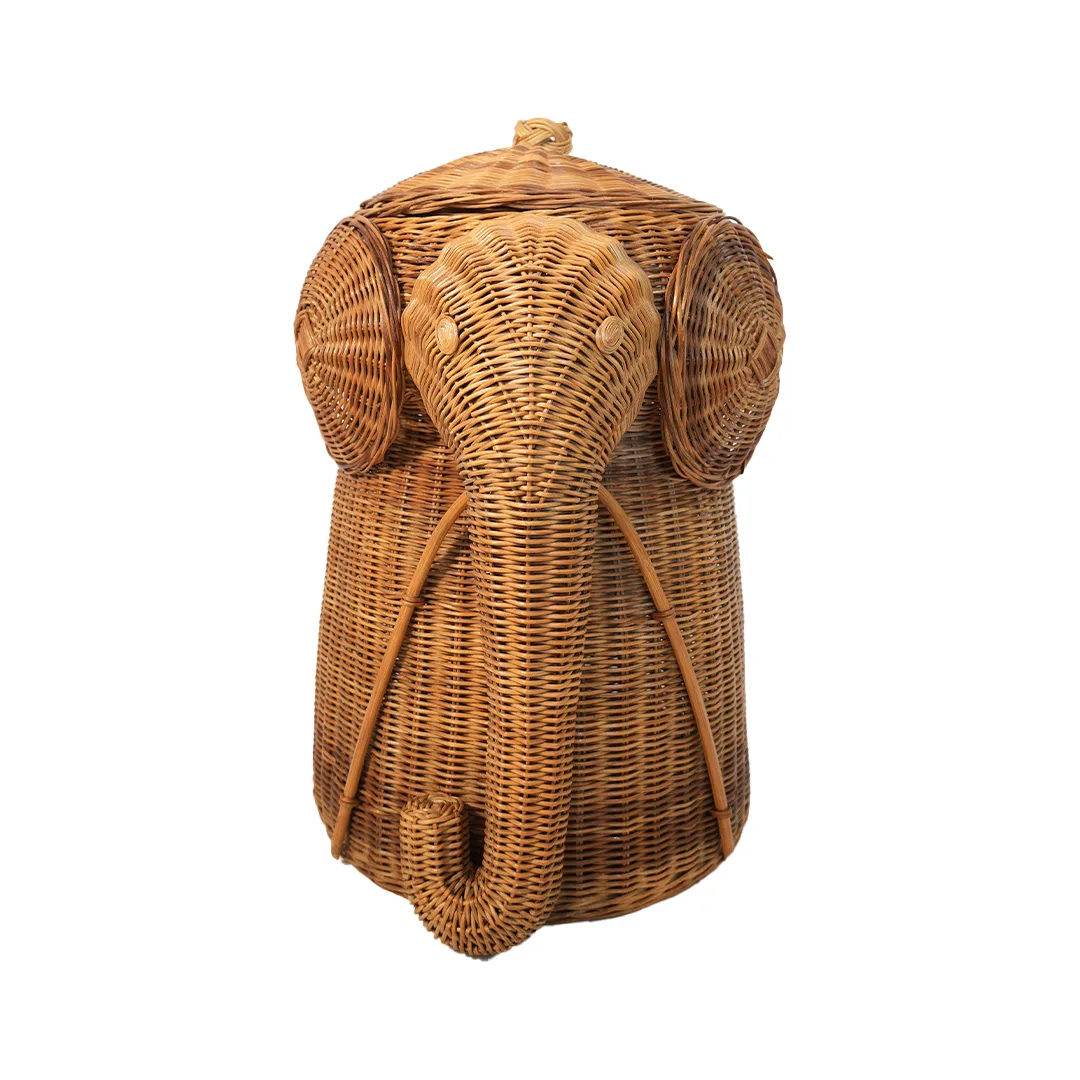 Dale un toque mágico y lleno de encanto a la habitación de tus pequeños con este adorable contenedor en forma de elefante, elaborado a mano con ratán y detalles en bambú por artesanos de Bali. Este contenedor es ideal para espacios infantiles, ya que permite mantener juguetes, peluches o accesorios bien organizados mientras aporta una estética cálida y temática tipo safari.