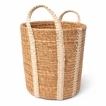 Organiza y decora tu hogar con este hermoso cesto de ratán con detalles en color beige, elaborado a mano por artesanos de Bali. Su diseño tejido presenta un patrón decorativo en tonos naturales que aporta textura, calidez y un estilo artesanal perfecto para cualquier ambiente.