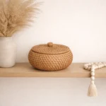 Descubre la elegancia natural de este pequeño contenedor hecho de ratán, una pieza artesanal elaborada a mano por artesanos de Bali. Su diseño lo convierte en el accesorio ideal para guardar accesorios o simplemente decorar cualquier espacio.