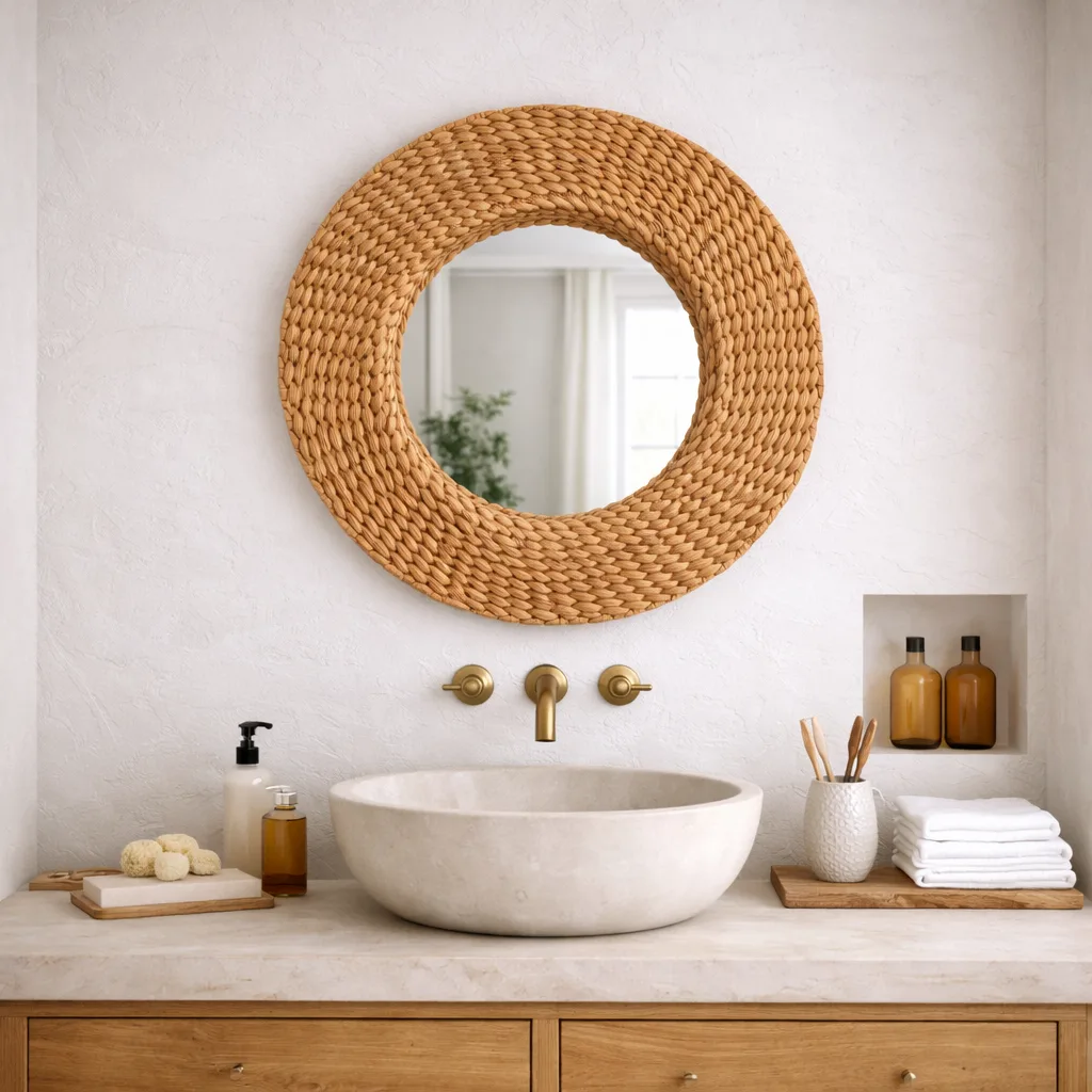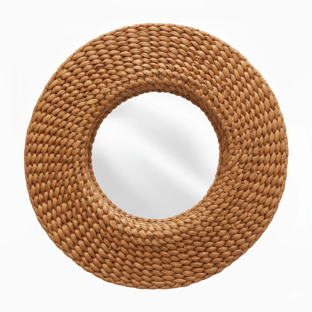 Espejo artesanal enmarcado y trenzado con fibras naturales de jacinto de agua, ideal para añadir un toque natural y bohemio a cualquier espacio. Su textura orgánica y diseño decorativo lo convierten en una pieza versátil que realza paredes en salas, dormitorios o entradas.