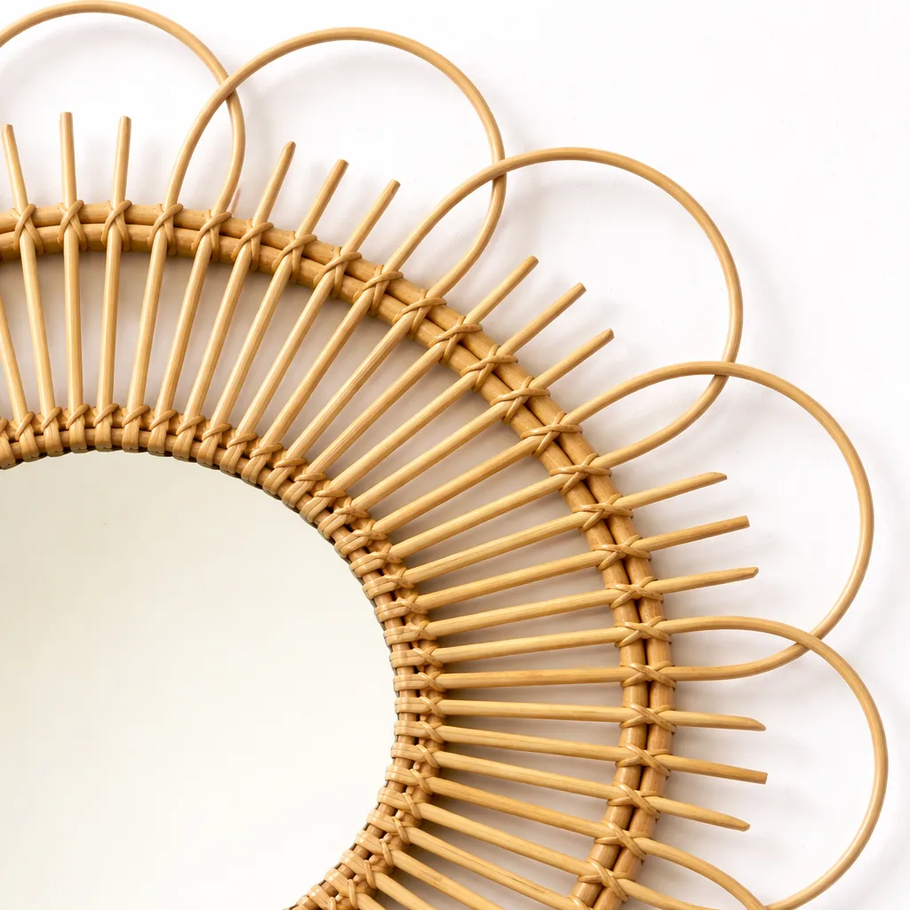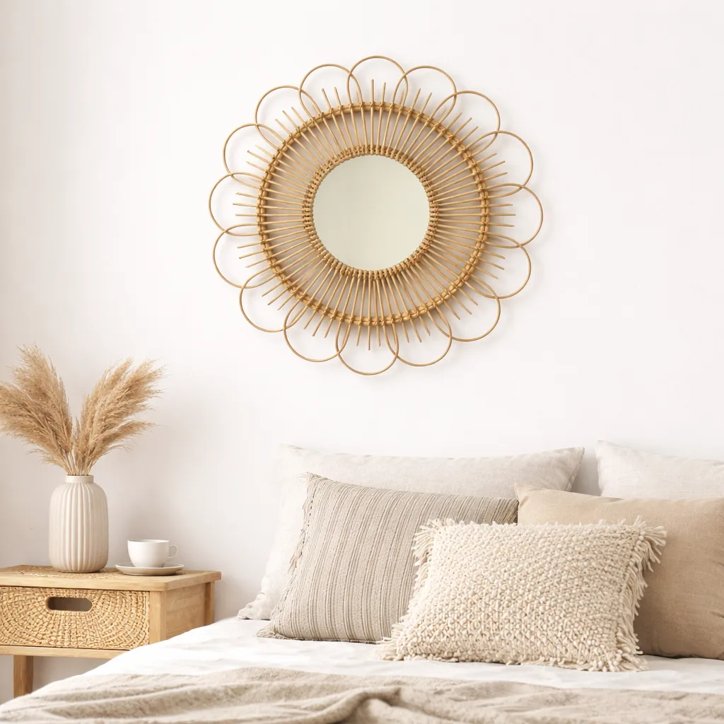 Este espejo de ratán ha sido tejido a mano por artesanos balineses que mantienen vivas sus tradiciones generacionales. Su acabado natural, sumado a su diseño inspirado en la naturaleza, lo convierte en una pieza única capaz de llenar cualquier ambiente de luz, armonía y el encanto relajado de Bali.