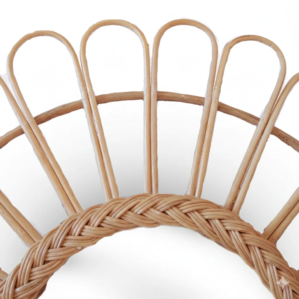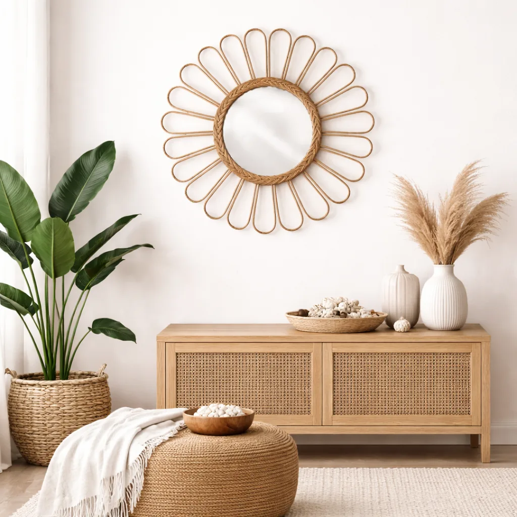 Este espejo de ratán ha sido tejido a mano por artesanos balineses que mantienen vivas sus tradiciones generacionales. Su acabado natural, sumado a su diseño inspirado en la naturaleza, lo convierte en una pieza única capaz de llenar cualquier ambiente de luz, armonía y el encanto relajado de Bali.