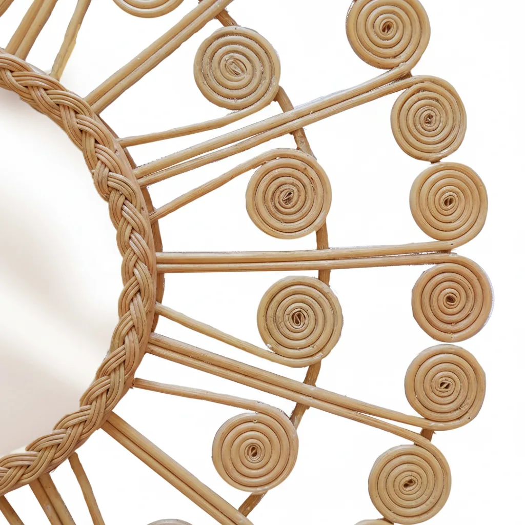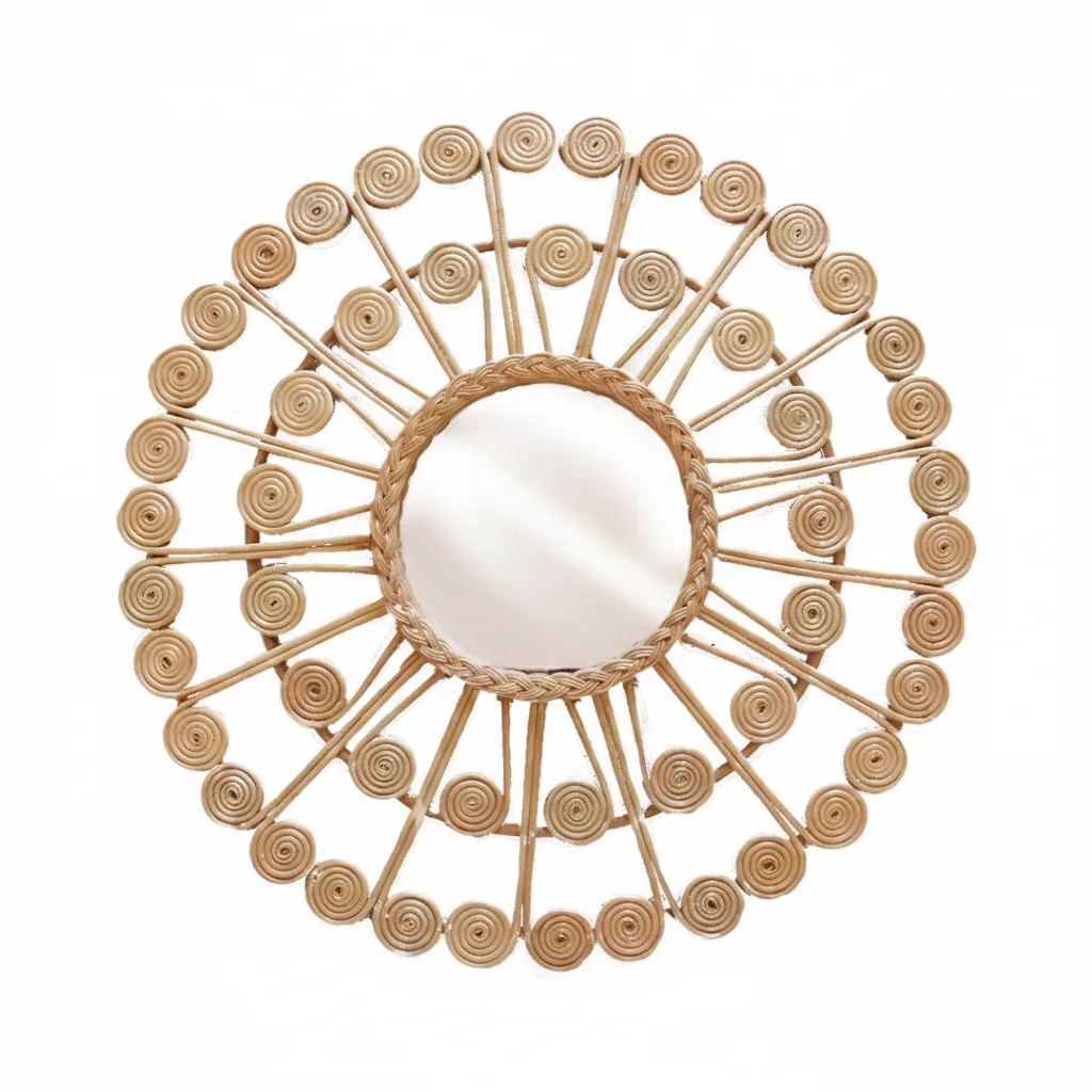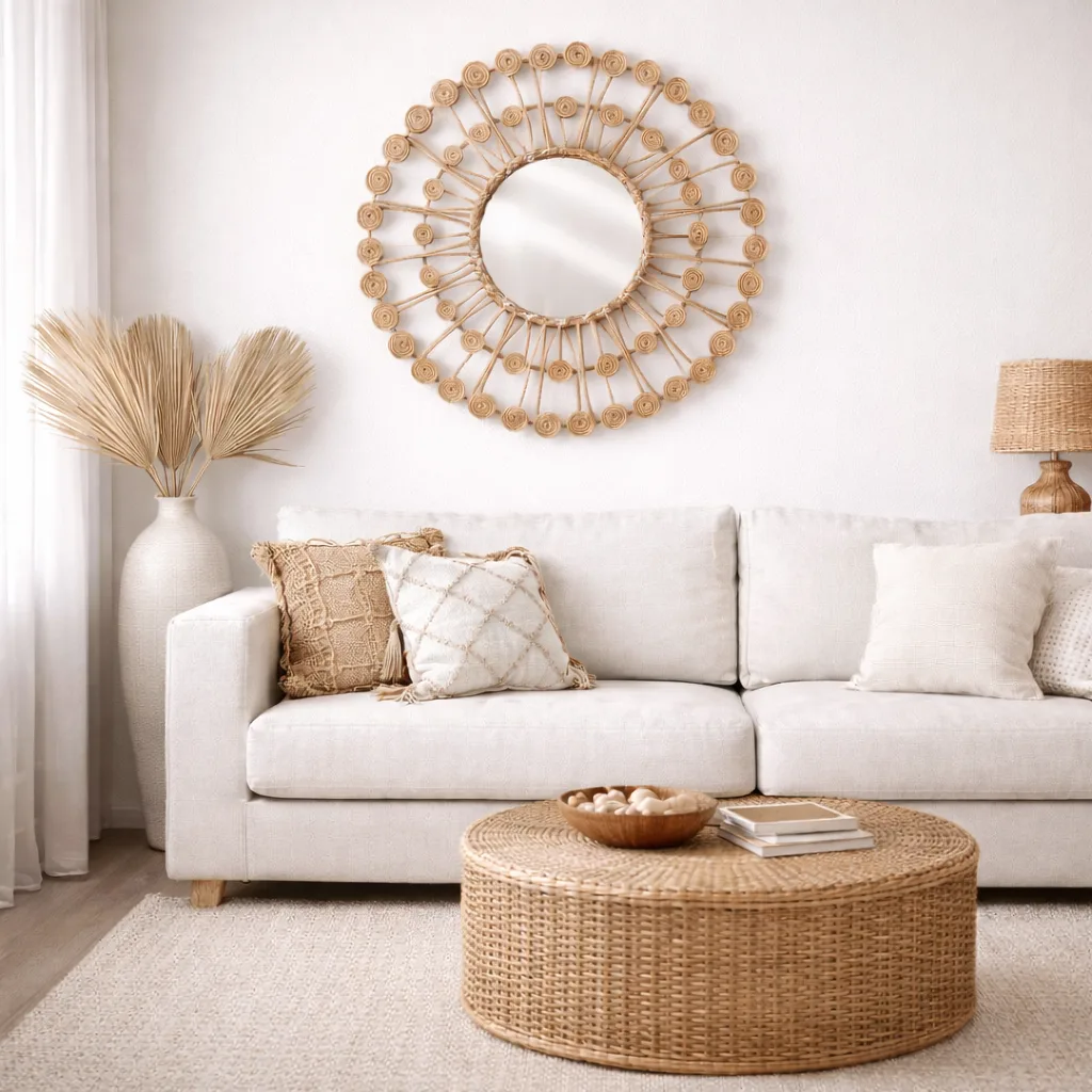 Este espejo de ratán ha sido tejido a mano por artesanos balineses que mantienen vivas sus tradiciones generacionales. Su acabado natural, sumado a su diseño inspirado en la naturaleza, lo convierte en una pieza única capaz de llenar cualquier ambiente de luz, armonía y el encanto relajado de Bali.