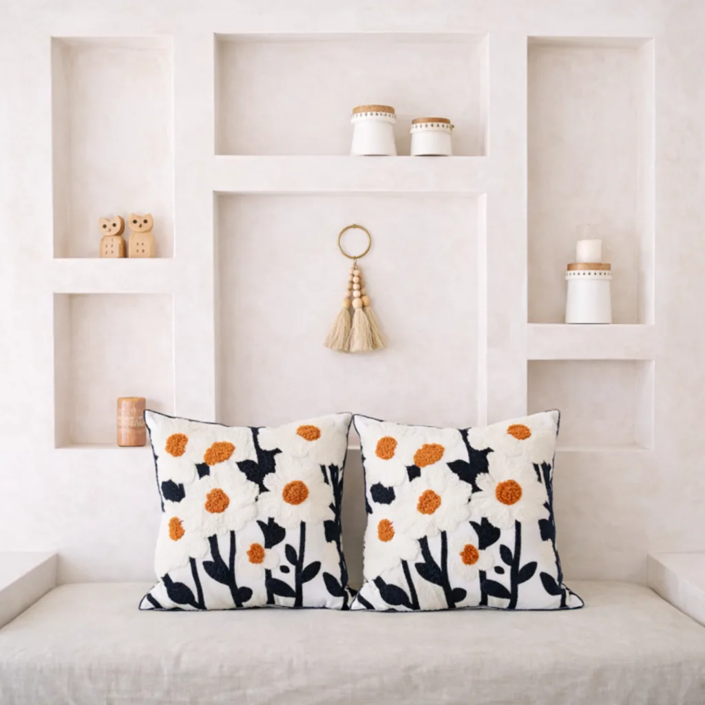 Descubre la calidez de nuestras fundas hechas 100% de algodón, cada pieza está elaborada y bordada con técnicas tradicionales. Su textura suave y su diseño único, las convierten en el complemento perfecto para sofás, camas o rincones especiales.