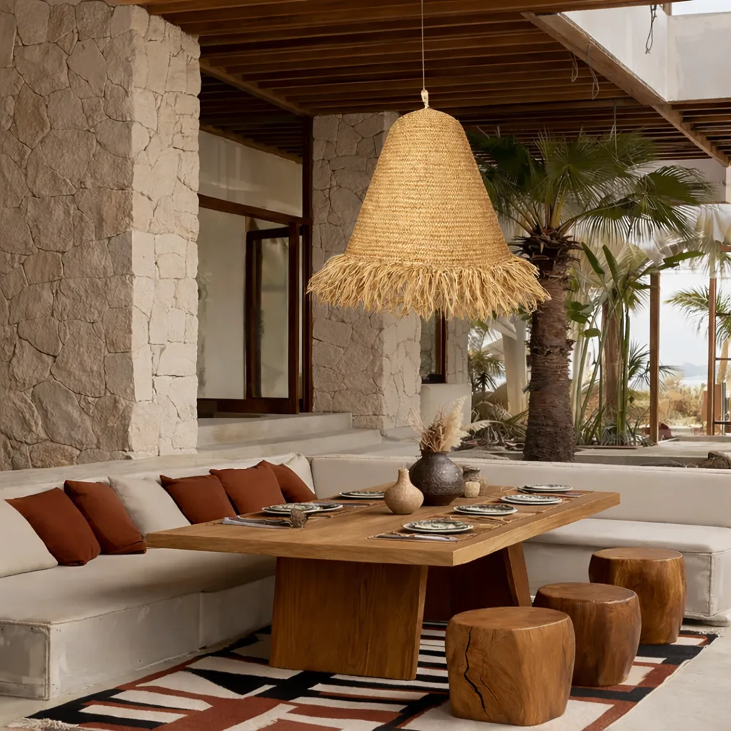 Lámpara confeccionada a mano con pasto marino natural, utilizando técnicas tradicionales de tejido balines. Su diseño orgánico y su textura trenzada aportan un carácter cálido y auténtico. Perfecta para aportar un toque natural y bohemio a cualquier espacio.
