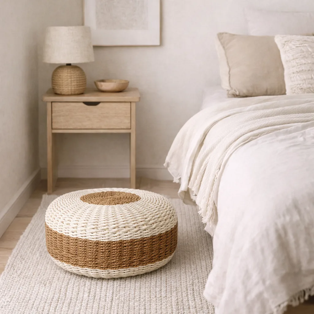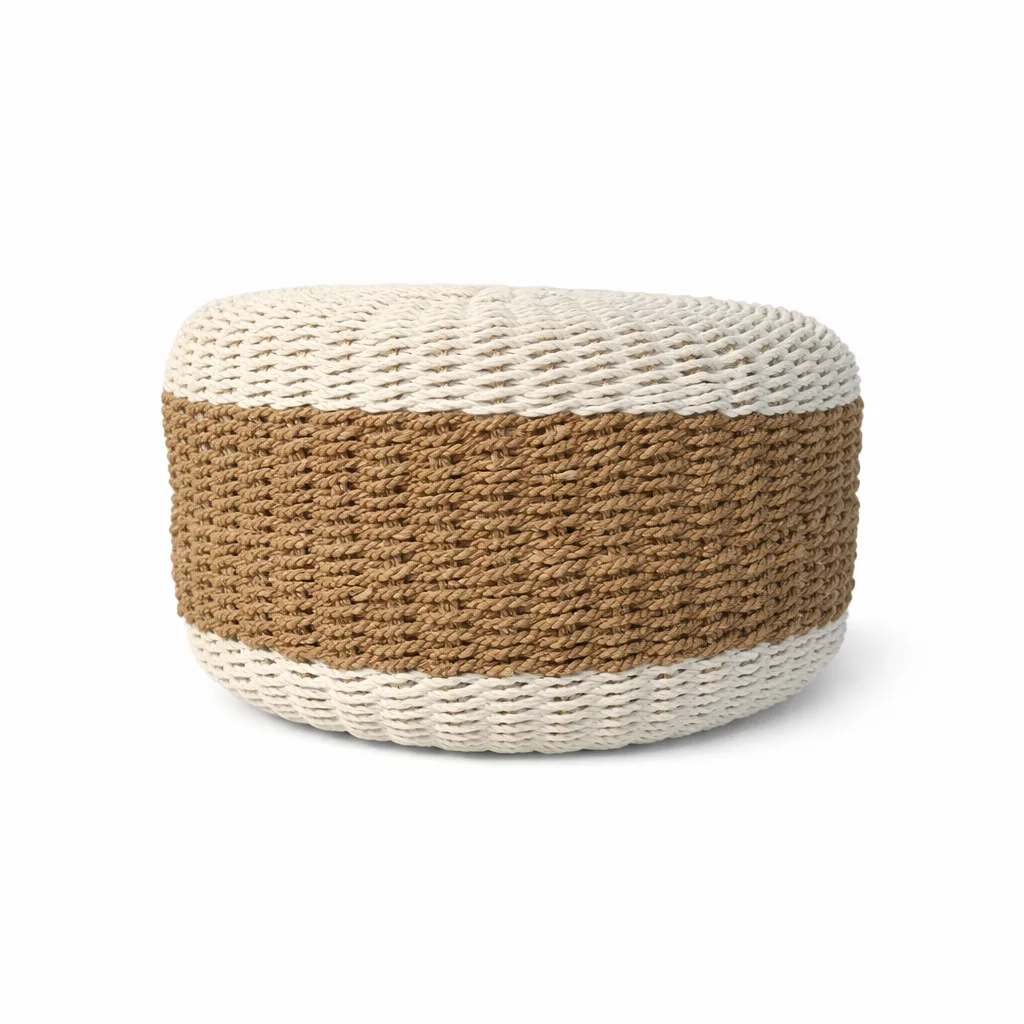 Puff elaborado artesanalmente con fibras naturales. Su combinación de tonos neutros y su textura trenzada aportan un estilo orgánico que complementa perfectamente diferentes espacios. Resistente y cómodo, ideal como asiento extra, reposapiés o acento decorativo que añade autenticidad y encanto natural al hogar.
