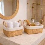 Set de cestos hechos de ratán, piezas elaboradas cuidadosamente por artesanos balineses, utilizando técnicas tradicionales de tejido y fibras naturales. Su diseño combina la calidez del ratán tejido a mano con un forro interior de algodón en tono crudo, que aporta suavidad, elegancia y un contraste perfecto.