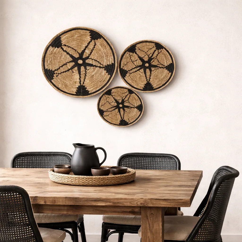 Platos artesanales hechos de hoja de plátano con acabados en macramé: una decoración ligera y natural que realza tus espacios, creando paredes llenas de textura y encanto boho, ideales para transformar cualquier ambiente en un rincón acogedor.