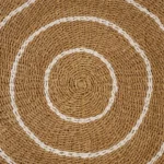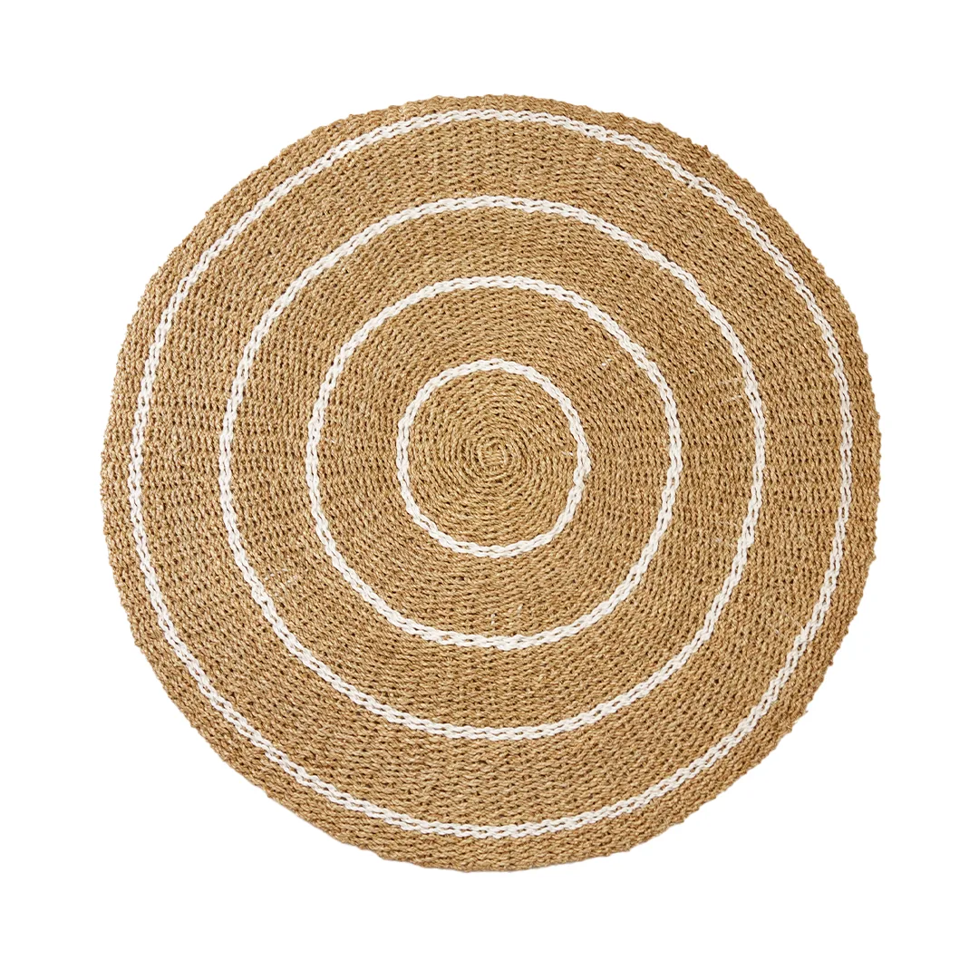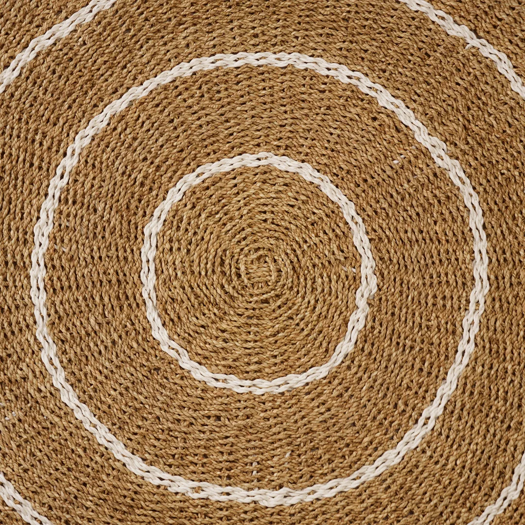 Tapete decorativo elaborado con pasto marino natural. Tejido a mano por artesanos de Bali. Su fibra resistente y su acabado artesanal lo convierten en una pieza versátil, perfecta para añadir un toque bohemio y acogedor a tu hogar.